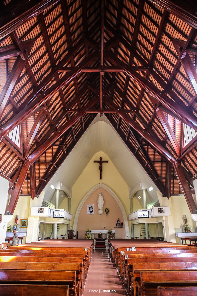 Mặt bằng nhà thờ theo hình chữ thập (giống thánh giá) có chiều dài 65 m, rộng 14 m, tháp chuông cao 47 m. Với độ cao đó, từ tháp chuông của nhà thờ có thể nhìn thấy mọi nơi của thành phố. Cửa chính của nhà thờ hướng về núi Langbiang.