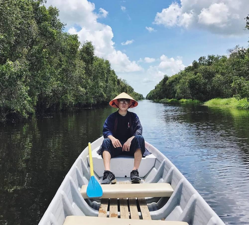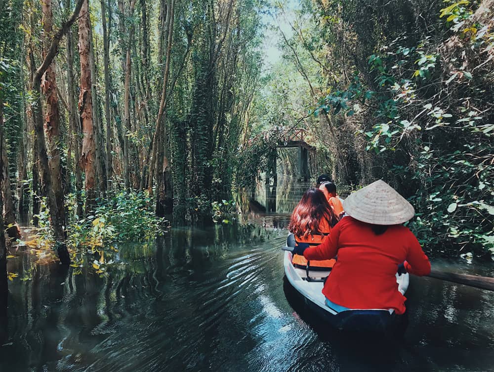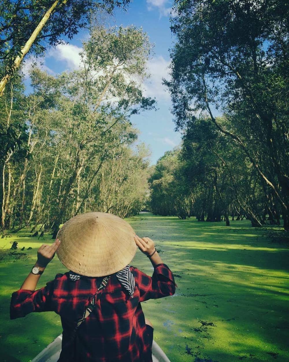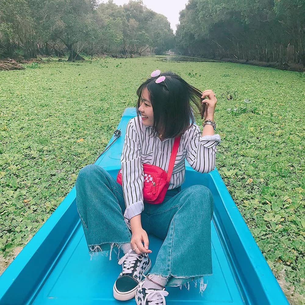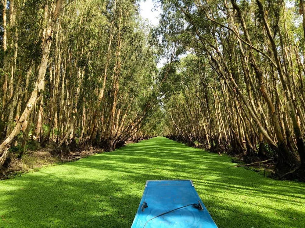 Mặt nước phủ xanh kín bèo tạo nên những hậu cảnh đẹp ngất ngây, được các tín đồ sống ảo yêu thích. Du khách được chở trên phương tiện có tên tắc ráng (tên gọi một phương tiện thủy có gắn động cơ của người miền Tây Nam Bộ) và xuồng để tham quan xuyên suốt rừng tràm. Vé tham quan rừng tràm khoảng từ 45.000-130.000 đồng/người, đi theo đoàn giá sẽ rẻ hơn. Ảnh: @anh.banhgau. @pinguyen1810.
