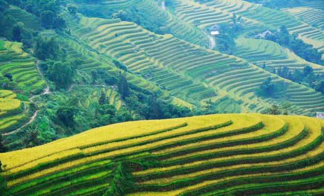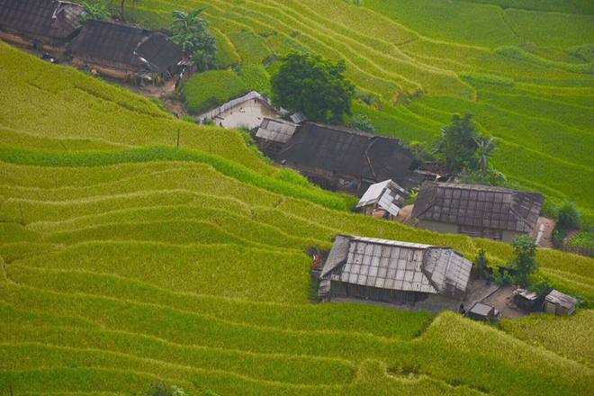 Theo thông lệ, Hoàng Su Phì là nơi lúa chín sau cùng, kết thúc cung đường ‘mùa vàng’ của các tỉnh vùng núi phía Bắc. Tuy nhiên, năm nay, do người dân cấy lúa sớm hơn, không đều và cũng bởi yếu tố thời tiết nên giữa tháng 9, lúa ở Hoàng Su Phì đã bắt đầu chín xen kẽ, tạo nên màu xanh vàng rực rỡ. Ảnh: Lê Tuấn.