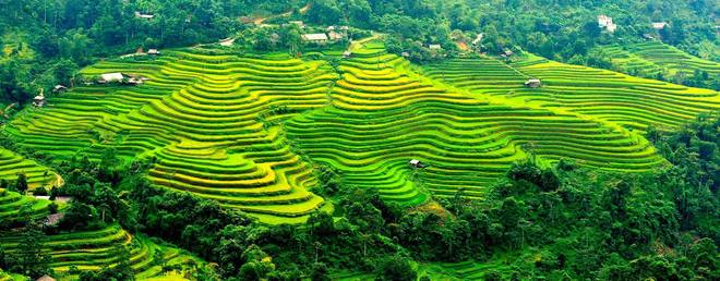 Đổi lại, bạn sẽ được chiêm ngưỡng cảnh sắc tuyệt đẹp của những thửa ruộng bậc thang đang vào mùa lúa chín vàng rực rỡ trải trên một diện tích rộng lớn. Ảnh: Vũ Chi.