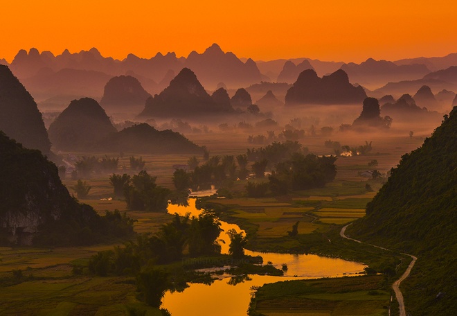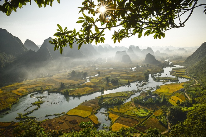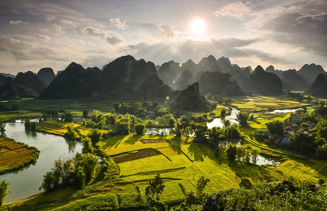 Hoàng hôn trên mùa vàng Phong Nậm, một xã biên giới của huyện Trùng Khánh. Tuy không nổi tiếng như ở Bản Giốc nhưng lại thu hút rất nhiều tay săn ảnh bởi cảnh đẹp mùa vàng hòa quyện với núi đồi trùng điệp.