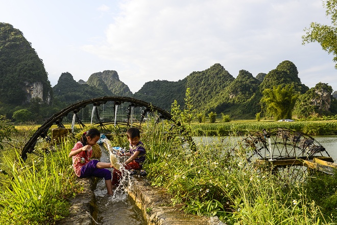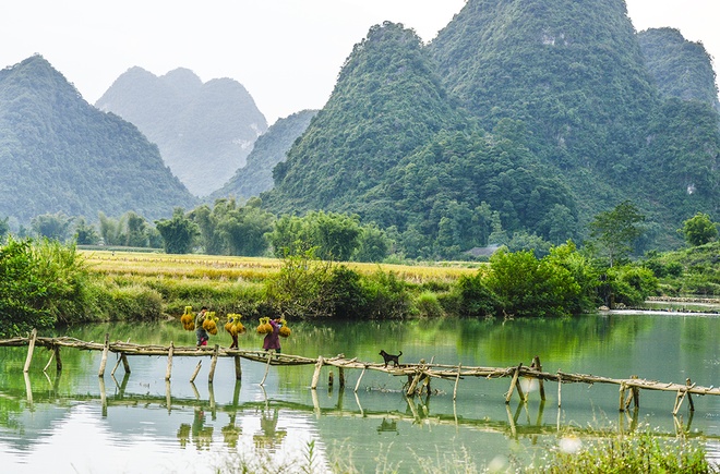 Bản Giốc là thác nước được mệnh danh đẹp nhất Việt Nam, thuộc huyện Trùng Khánh, Cao Bằng, giáp biên giới Trung Quốc. Tuy đây không phải thời điểm thác nhiều nước nhất, nhưng khung cảnh lúa vàng lại thu hút du khách đến Bản Giốc dịp này.