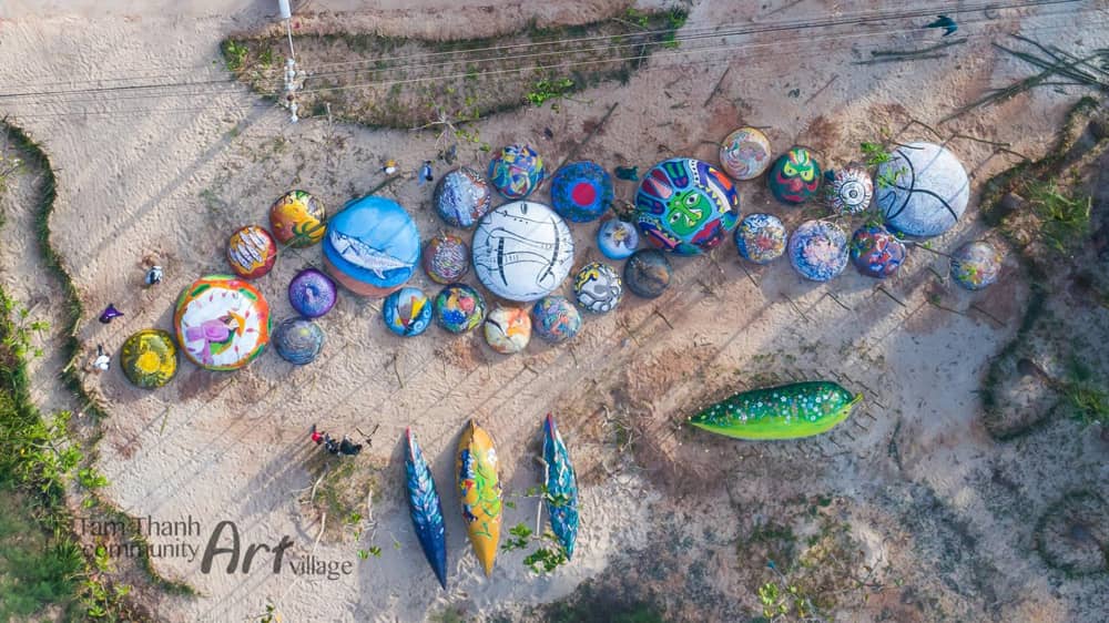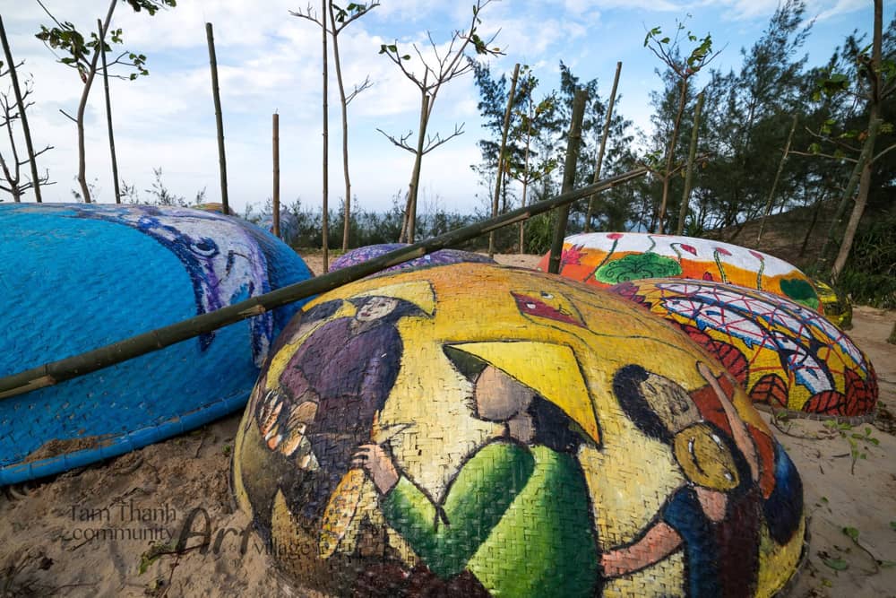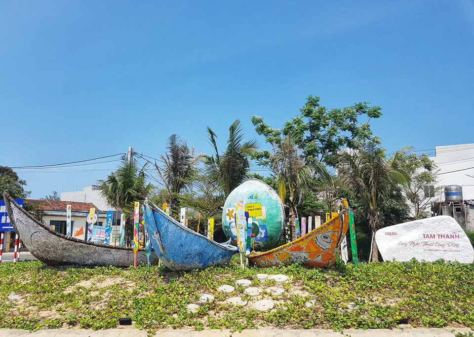 Làng bích họa Tam Thanh cũng có nhiều thay đổi so với lúc mới đầu hoàn thành để phục vụ du khách tốt hơn. Nhiều bức tường, căn nhà tháo dỡ và xây mới. Hay con đường thuyền thúng dựng lên với những chiếc thuyền trang trí đầy ấn tượng, xếp trong khoảng đất trống gần biển tạo nên một khung cảnh thú vị nhưng cũng rất bình yên. Ảnh: Hà Nguyễn.