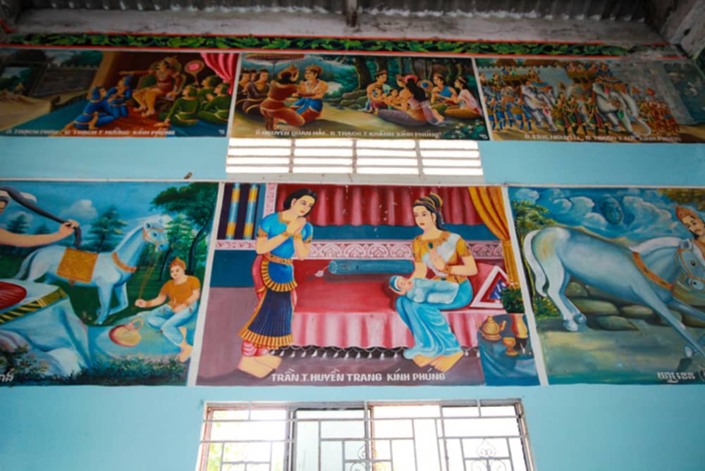 Trên trần nhà là những bức bích họa kể về công việc và con đường tu hành của Đức Phật.