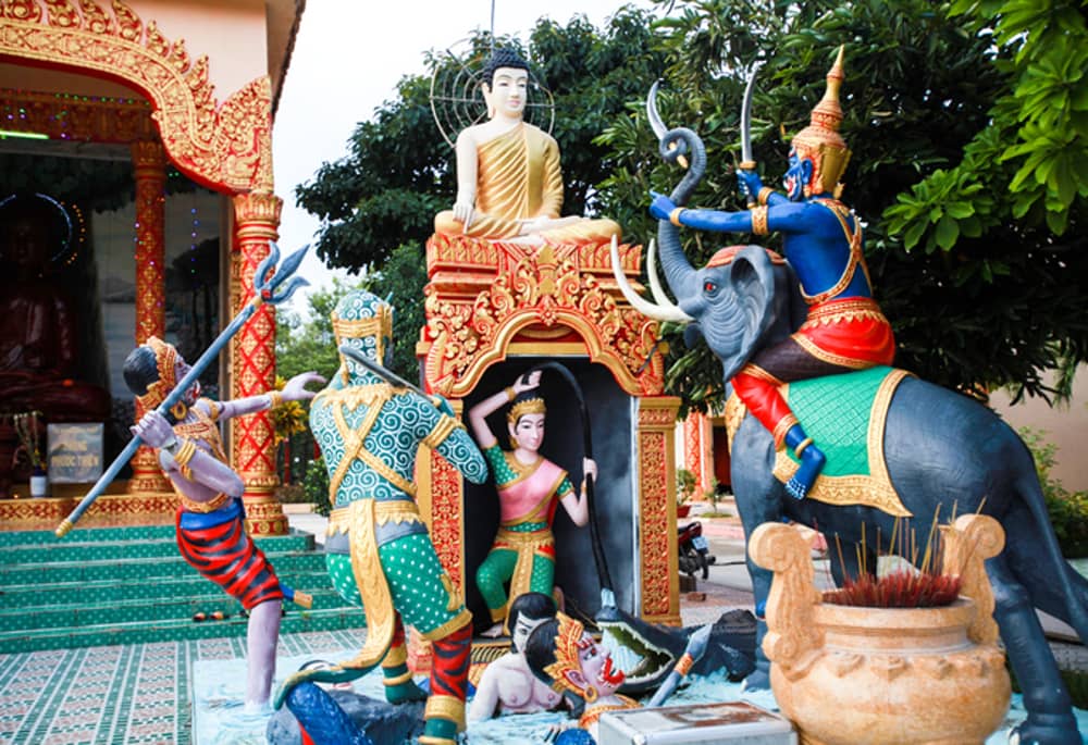 Người Khmer theo Phật giáo tiểu thừa, thờ phật Thích Ca. Hiện chùa có đến 115 pho tượng các loại làm bằng xi măng, đất, một bia đá và một quả chuông có từ năm 1887.