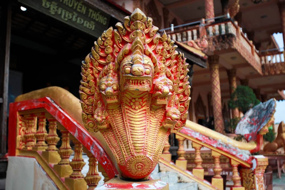 Khắp các công trình kiến trúc trong chùa, du khách sẽ dễ dàng bắt gặp nhiều tượng rắn thần Naga 5 đầu. Đây là hình ảnh tượng trưng cho lòng vị tha của Đức Phật, ngụ ý rằng giáo lý Phật pháp soi sáng cho nhân loại, giúp mọi người sống hướng thiện như chính loài rắn đã được thuần hóa và phục thiện.