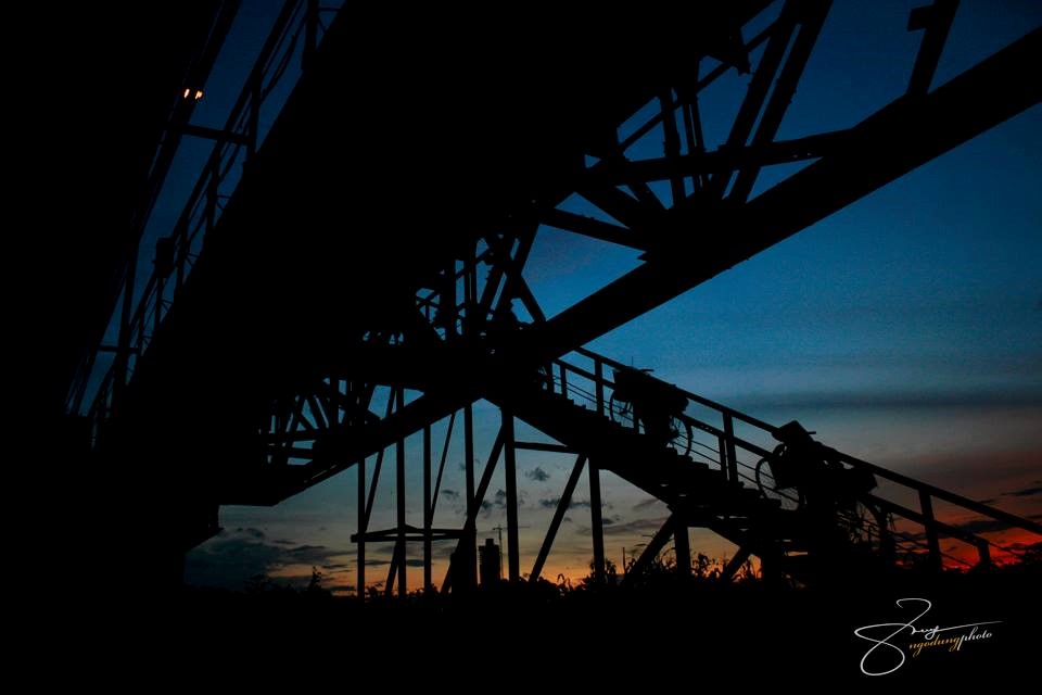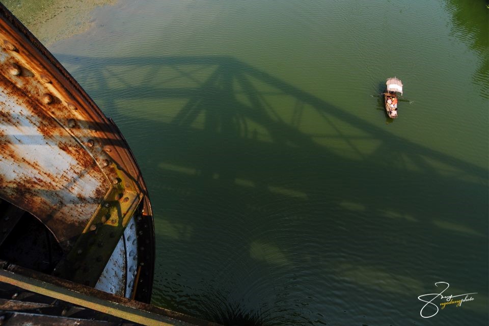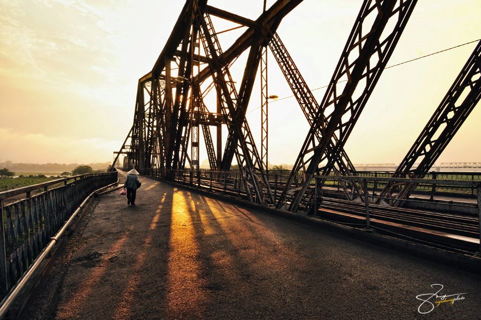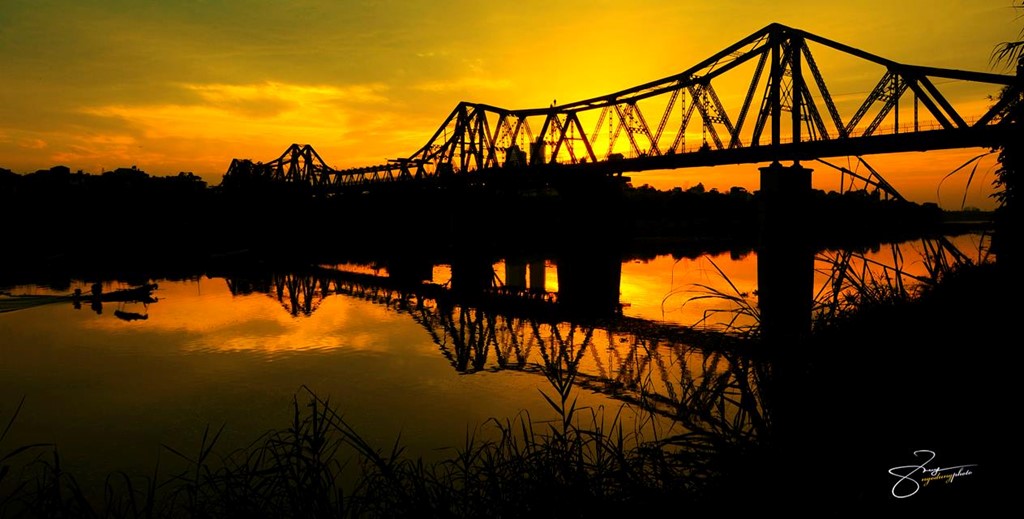 Cây cầu dưới ánh hoàng hôn. Tia nắng buông quyện với màu vàng, nâu của cầu Long Biên tạo nên khung cảnh lãng mạn trên sông.