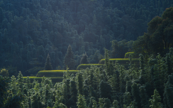 Một thửa ruộng bậc thang ở xã Hồ Thầu nằm giữa những vạt rừng trong ánh nắng chiều.