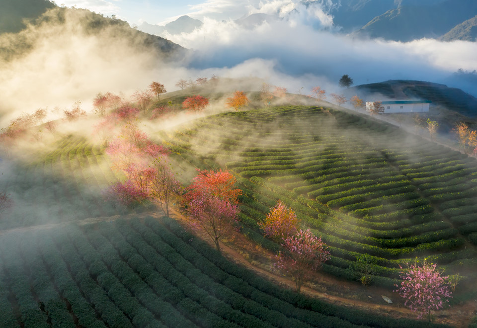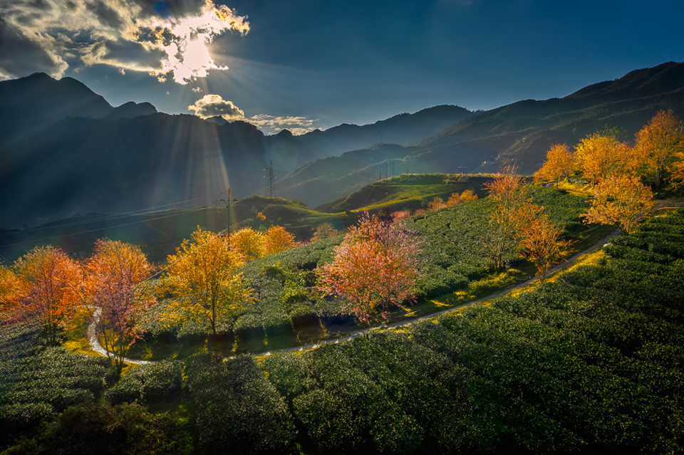 Không gian khoáng đạt, trữ tình của của đồi chè Ô Long vào những ngày nắng xua tan cái rét thấu xương của mảnh đất vùng cao. Những giọt nắng như rót mật xuống từng tán cây, làm hoa đào ánh vàng đẹp mắt.