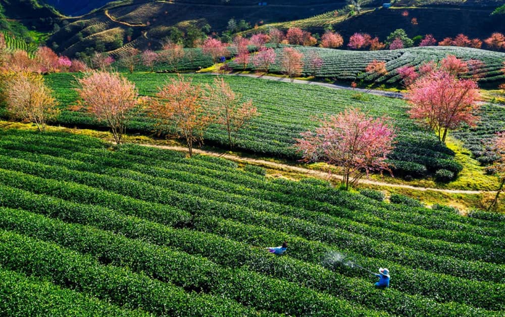 Điểm nổi bật và khác biệt của đồi chè Ô Long nằm ở hàng dài những cây hoa anh đào nở rộ khoe sắc hồng thắm trên nền búp chè xanh. Hàng hoa anh đào được trồng men theo lối đi quanh đồi chè. Nhìn từ trên cao, những vạt nắng rải đều khắp đồi, lấp lánh trên từng cây hoa, tạo quang cảnh vừa nên thơ vừa hùng vĩ.