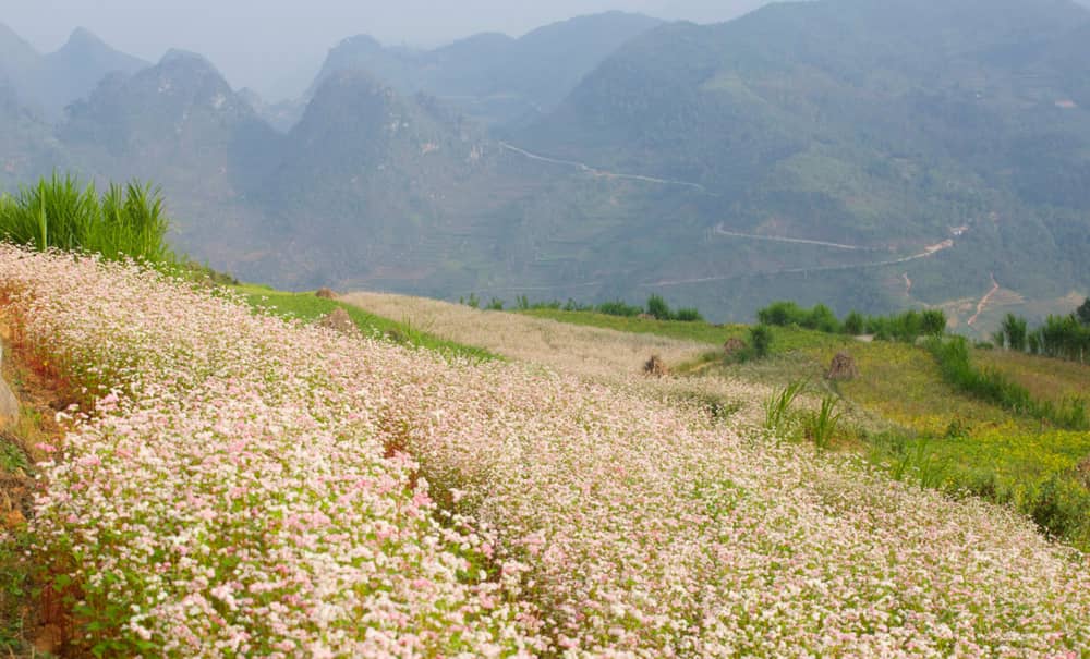 Khác với hoa tam giác mạch ở các nơi khác, ở Hà Giang loại hoa này có màu phơn phớt hồng, mọc thành từng cánh đồng lớn ven đường, thung lũng thậm chí len lỏi trên những vách đá lởm chởm. Những cánh đồng hoa trải dài tạo cho nơi đây cảnh sắc vừa nên thơ vừa hùng vĩ.