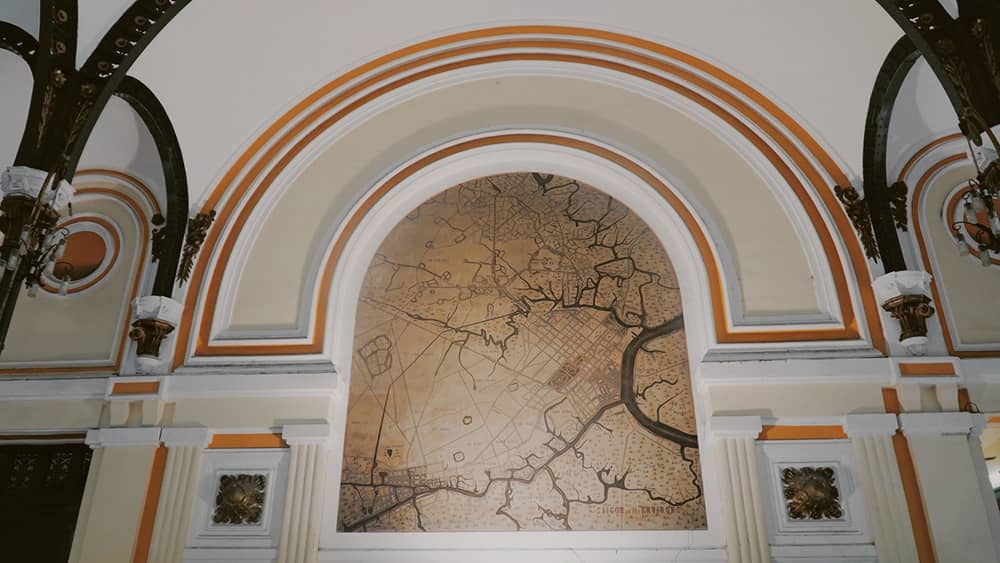 Phía bên phải tiền sảnh là tấm bản đồ mang tên "Saigon et ses environs 1892" thể hiện địa lý Sài Gòn và vùng xung quanh.