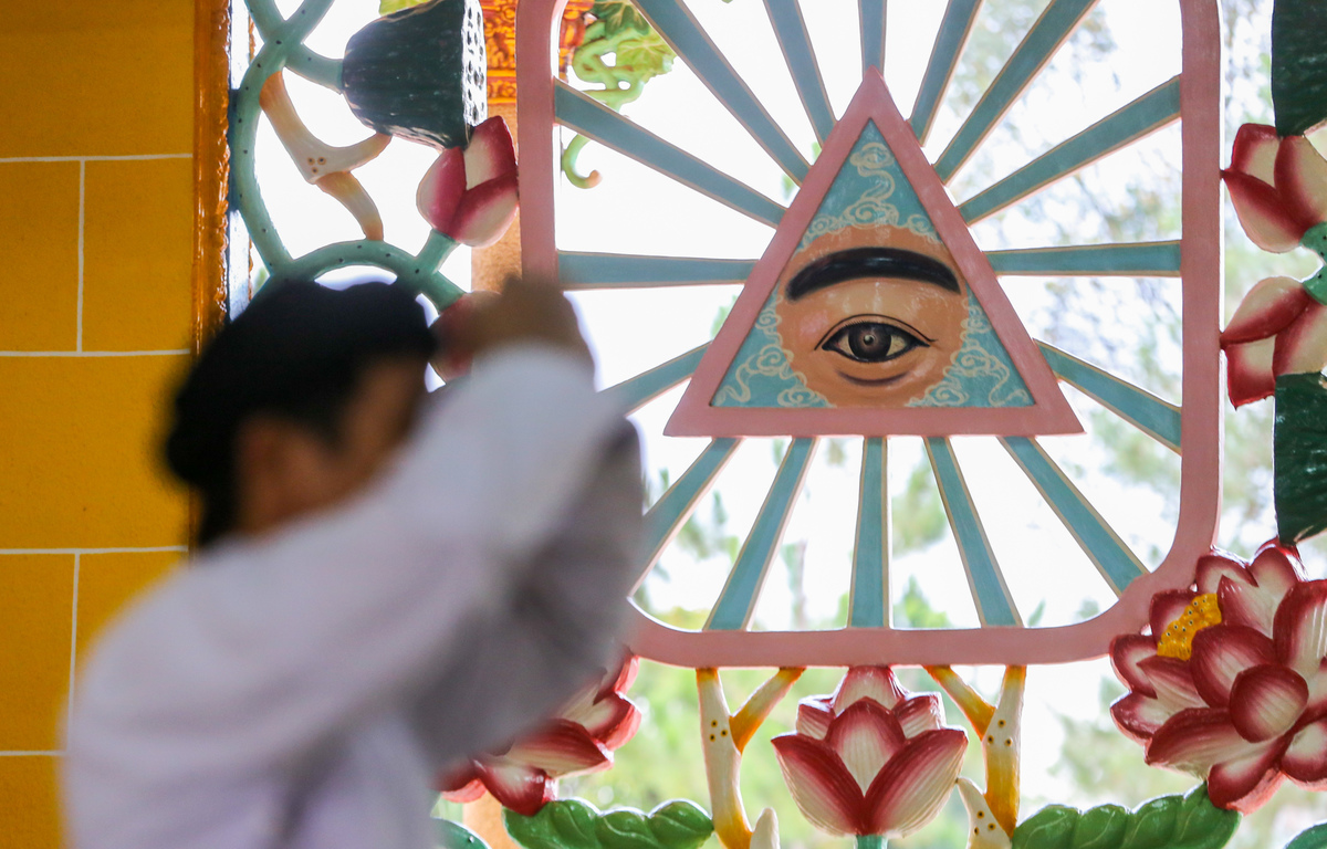 Biểu tượng của đạo Cao Đài là hình một con mắt nằm trong hình tam giác, tượng trưng cho Thượng đế. Ngoài ra, đạo còn thờ các vị như Phật Thích Ca, chúa Jesus, Khổng Tử, Lão Tử, Phật Bà Quan Âm... Những hình ảnh này được khắc họa nhiều nơi quanh Tòa thánh, nhất là cửa chính.