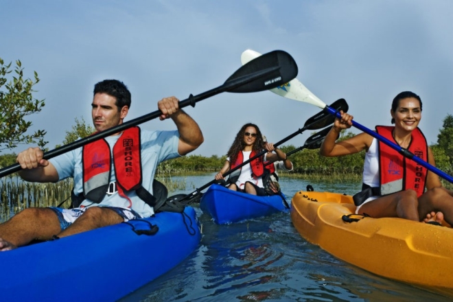 Chèo thuyền kayak giữa rừng đước: Bờ biển của Abu Dhabi có các rừng đước và nhiều loài chim thú vị, rất hợp để du khách khám phá bằng thuyền kayak.