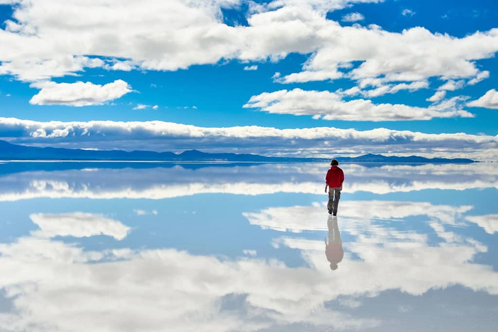 Thời điểm đẹp nhất để tham quan Salar de Uyuni là ngay sau mùa mưa (từ tháng 12 đến tháng 3). Trong thời gian này, mặt hồ có một lớp nước mỏng, tạo thành tấm gương lớn, phản chiếu vạn vật và mây trời. Ảnh: Juan Martinez.