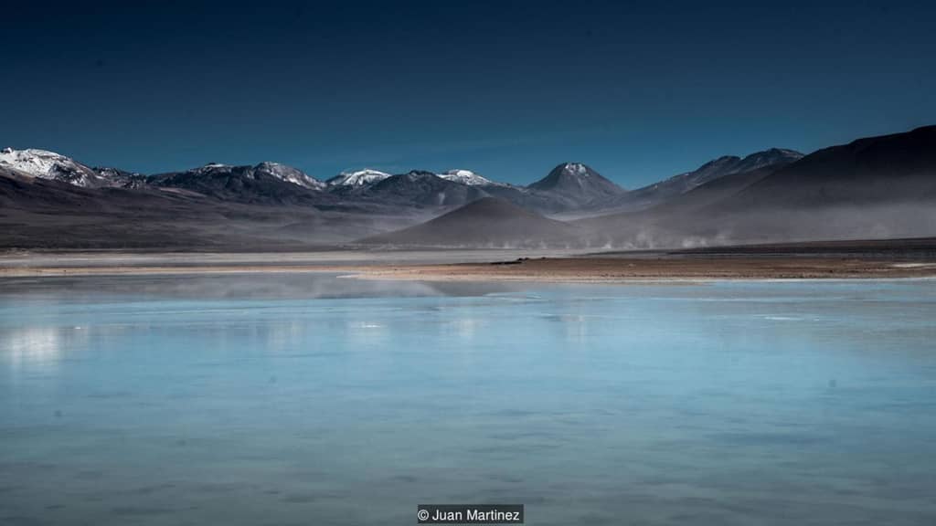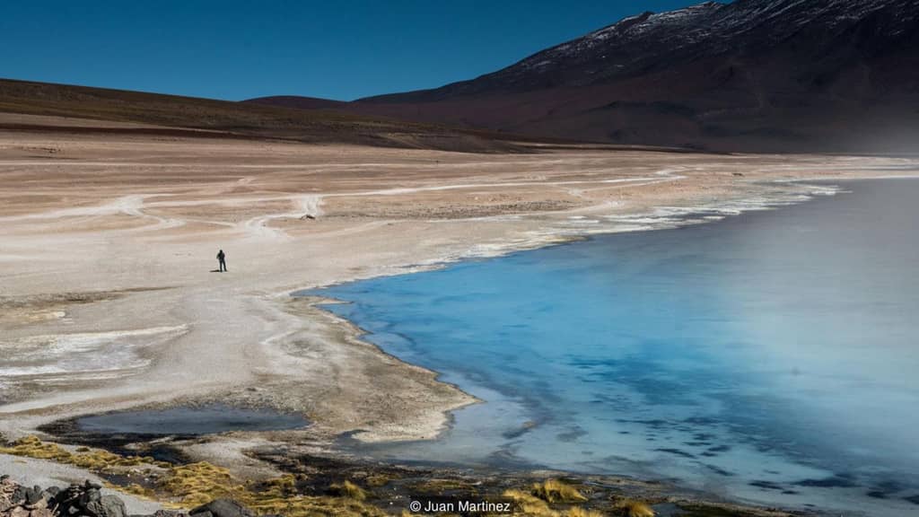 Mauro Berna, hướng dẫn viên du lịch, thông tin màu sắc của hồ nước còn phụ thuộc vào các yếu tố như nhiệt độ, gió và thời gian trong ngày. Khi dạo bước quanh các hồ vào một buổi sáng băng giá, lớp sương mỏng và bụi borax lượn lờ gần mặt nước khiến nơi đây tựa một hành tinh xa lạ. Ảnh: Juan Martinez.