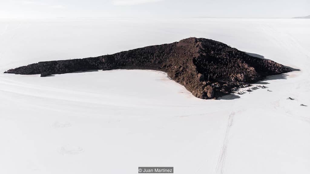 Dạo bước trên cánh đồng muối lớn nhất thế giới, thỉnh thoảng du khách bắt gặp những ngọn núi lửa nằm rải rác, tạo thành các chấm đen nổi bật giữa khung cảnh trắng xóa. Nổi tiếng nhất trong số đó là ngọn núi được mệnh danh "ngôi nhà của người Inca". Nếu để ý, du khách có thể thấy dấu tích của san hô và vỏ sò xung quanh. Cách đây khoảng 20.000-40.000 năm, toàn bộ khu vực này là một hồ nước mặn khổng lồ. Ảnh: Juan Martinez.