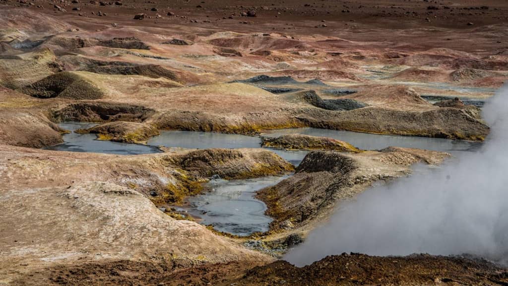 Theo các chuyên gia tại cơ quan Bảo vệ Khu vực Quốc gia của Bolivia (SERNAP), các yếu tố địa chất cần thiết để tạo nên Salar de Uyuni ảnh hưởng đến phần lớn vùng đất phía tây nam của quốc gia này. Cách cánh đồng muối chưa đầy 300 km về phía nam, khu bảo tồn động vật quốc gia Eduardo Avaroa sở hữu những vùng địa nhiệt đầy màu sắc như lưu vực Sol de Manana (hay còn gọi là Mặt trời Buổi sáng). Ảnh: Juan Martinez.