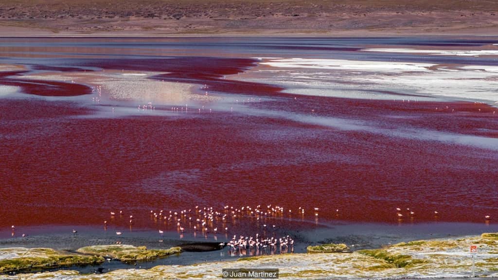 Cũng nằm trong khu bảo tồn và cách Sol de Manana khoảng 45 km, Laguna Colorada (hay còn gọi là đầm Đỏ) là hồ nước mặn nổi tiếng với sắc đỏ rực rỡ. Màu của hồ xuất phát từ tảo dunaliella salina và các trầm tích của sinh vật phù du. Ảnh: Juan Martinez.