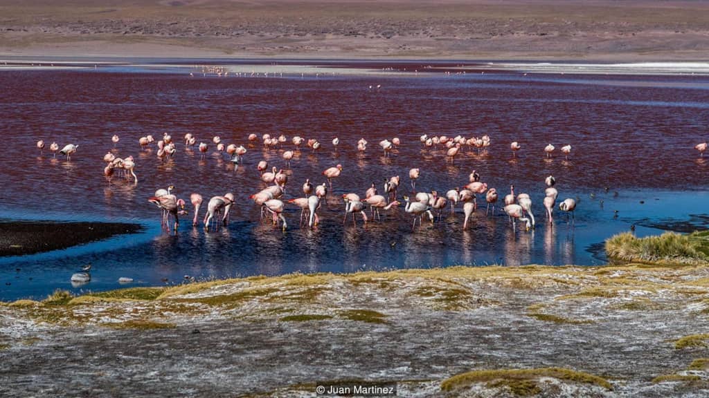 Laguna Colorada còn là môi trường hoàn hảo cho loài hồng hạc làm tổ. Ngoài bãi bùn lầy ngăn kẻ săn mồi, vùng nước cung cấp lượng lớn thức ăn cho loài sinh vật này. Trong số 6 loài hồng hạc trên thế giới, các nhà khoa học phát hiện 3 loài ở đầm Đỏ, gồm một loài được cho là đã tuyệt chủng. Ảnh: Juan Martinez.