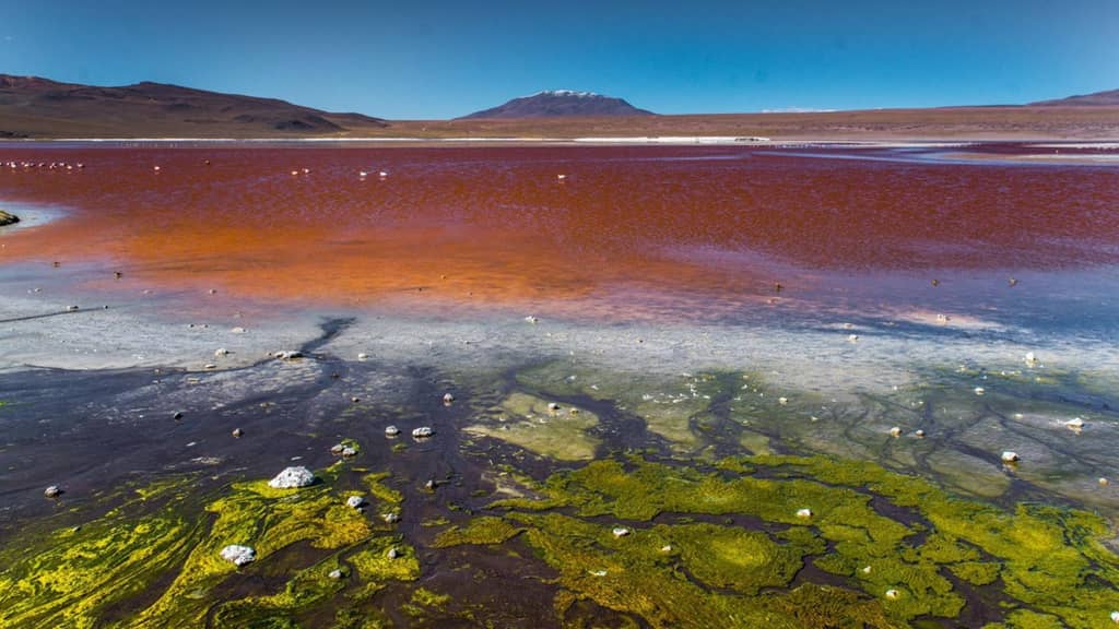 Sự cân bằng hoàn hảo giữa các yếu tố tự nhiên và màu sắc khiến Laguna Colorado đẹp tựa tranh vẽ. Lớp borax trắng nổi bật giữa màu vàng xanh của rêu và đỏ rực của hồ nước. Tuy nhiên, nhiều chuyên gia quan ngại môi trường tại đây có thể thay đổi sau khi nhà máy địa nhiệt cách Laguna Colorada khoảng 40 km được xây dựng. Ảnh: Juan Martinez.