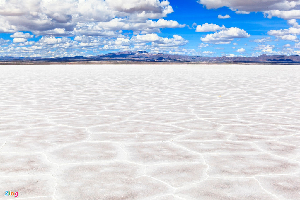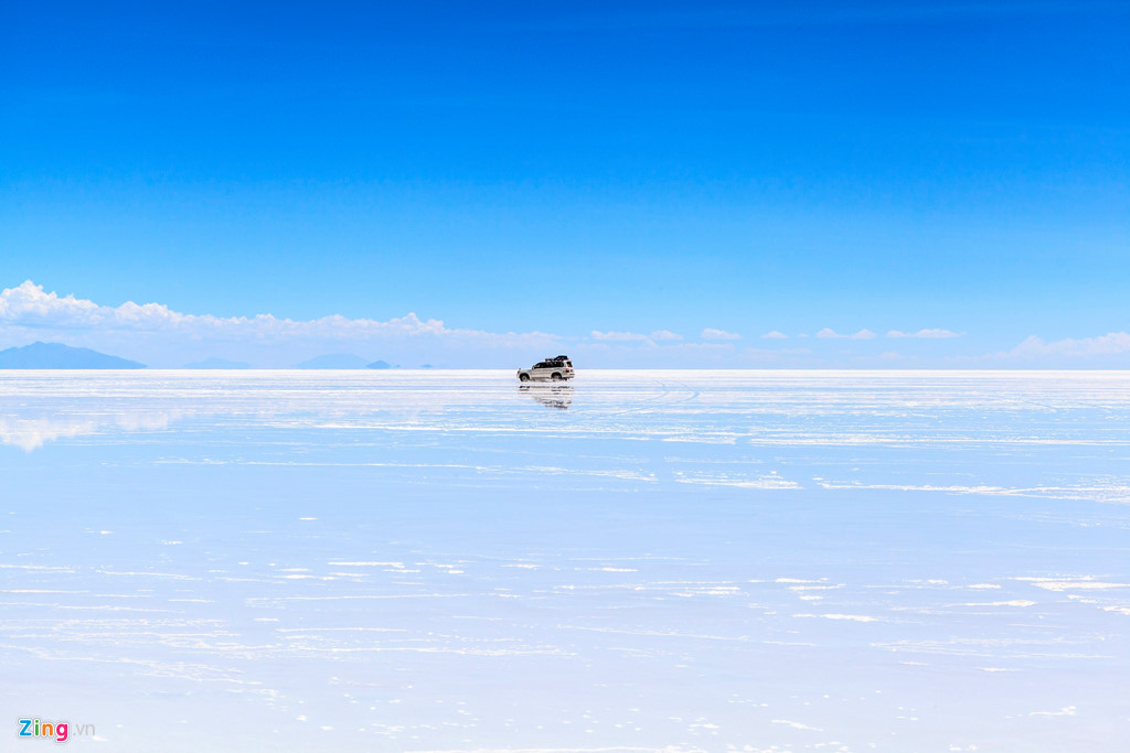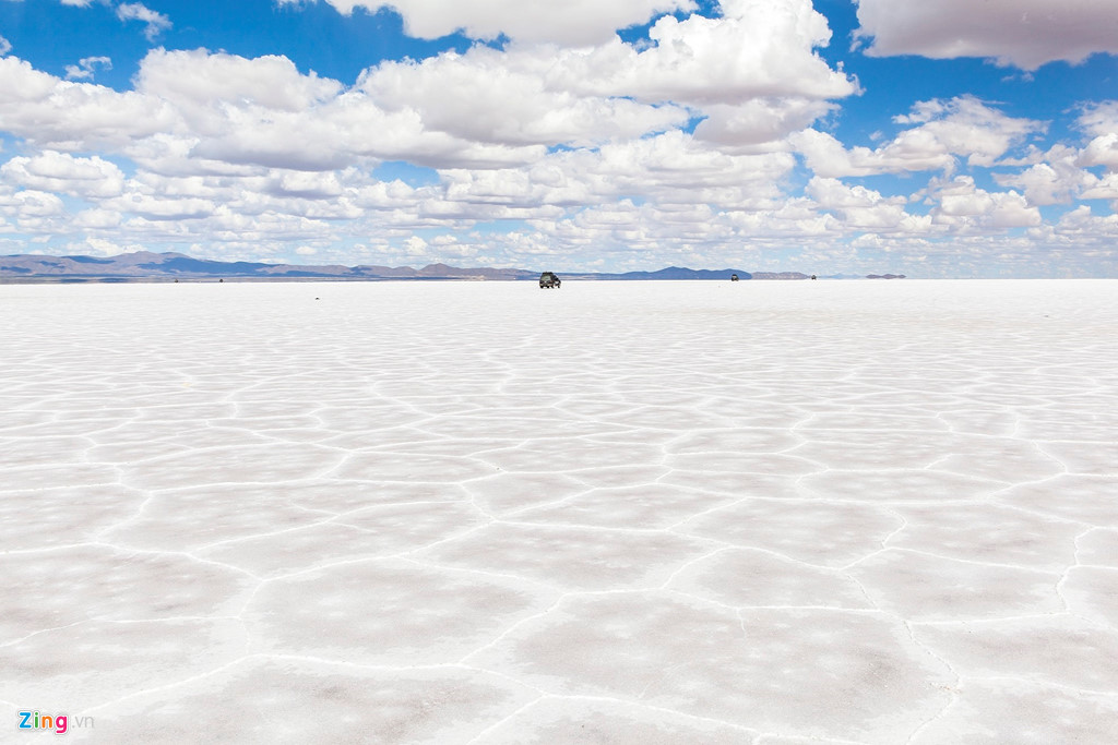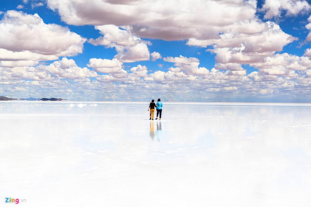 Salar de Uyuni như một chiếc gương khổng lồ, phản chiếu bầu trời xanh thẳm, những cuộn mây trắng như bông, nằm trên độ cao gần 4.000 mét so với mặt nước biển.