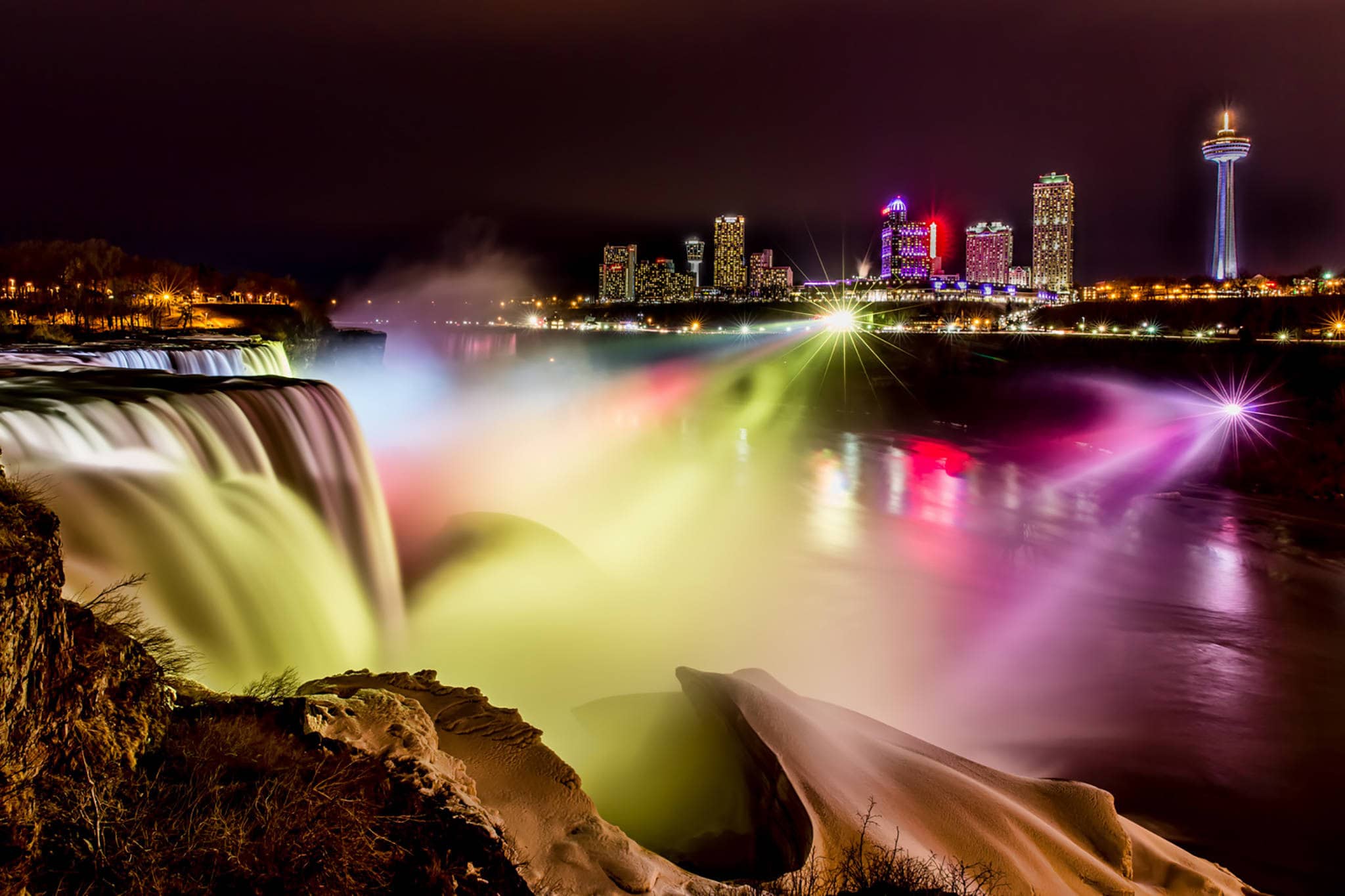 Trong đêm tối giá lạnh của vùng Bắc Mỹ, thác Niagara, ngọn thác hùng vĩ bậc nhất thế giới nằm giữa biên giới giữa Canada và Mỹ, rực sáng với muôn vàn sắc màu rực rỡ.