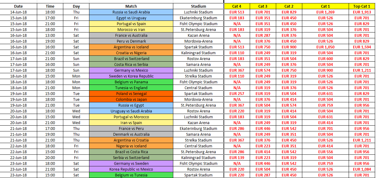 Trận khai mạc World Cup 2018 sẽ diễn ra vào ngày 14/6, trận chung kết sẽ được tổ chức 1 tháng sau đó, vào ngày 15/7. Các trận đấu của VCK World Cup 2018 sẽ được tổ chức tại 12 SVĐ trên khắp nước Nga. Và cho đến thời điểm này BTC đã công bố chỗ ngồi dự kiến cũng như giá vé các trận đấu trong khuôn khổ VCK WorldCup 2018