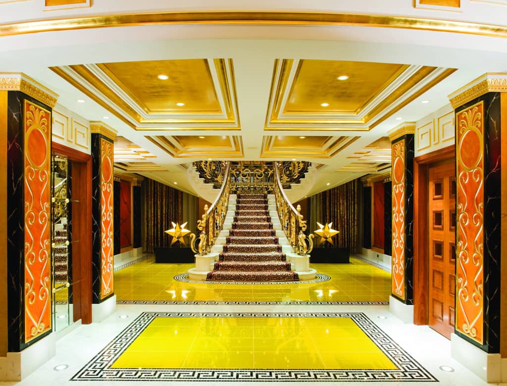 Nội thất xa hoa bên trong khách sạn khiến bạn thêm phần trầm trồ. Gần 240.000 m2 tường bao phủ đá cẩm thạch. Sàn nhà lát đá cẩm thạch statuario hiếm và quý nhất ở Italy. Vàng 24 cara bao phủ hơn 2.043 m2 nội thất, bao gồm cả màn hình tivi. Tất cả 202 phòng đều có tầm nhìn ngoạn mục hướng ra vịnh Ba Tư. Ảnh: Dubai-Infoguide.de.