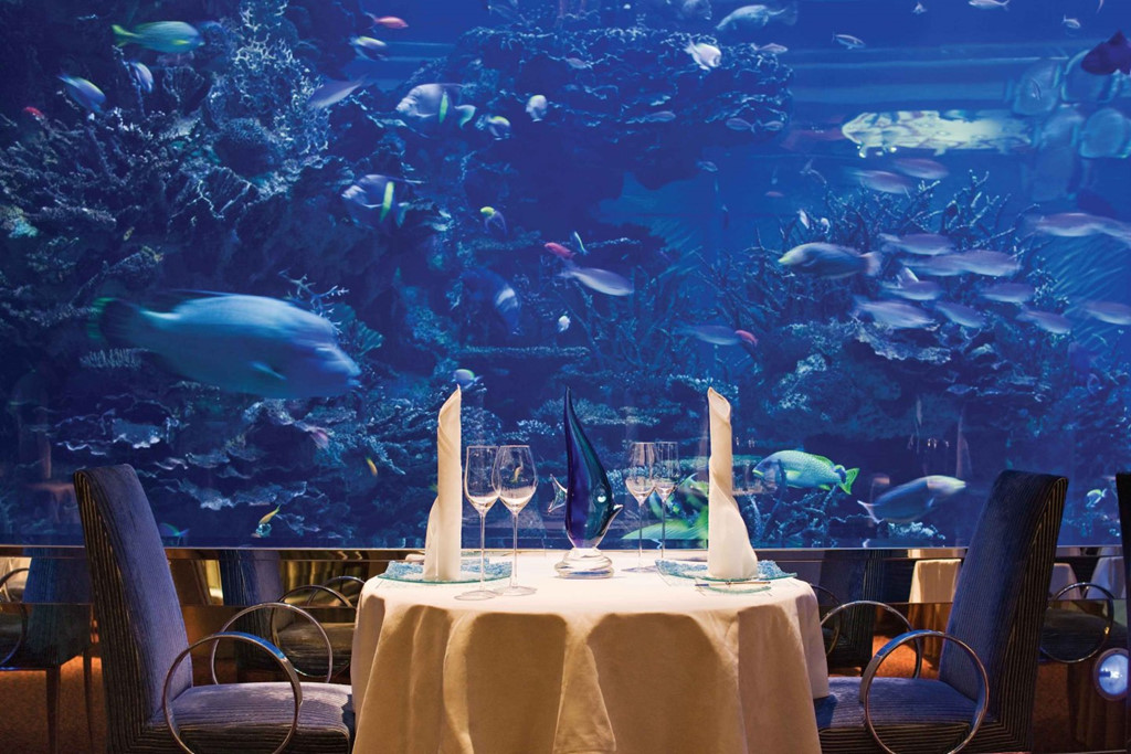 Với thiết kế bể cá khổng lồ chứa gần 1.000 m3 nước ở khu vực chính, nhà hàng Al Mahara là điểm đến lý tưởng để bạn và người thân dùng bữa tối thân mật. Dubai là điểm du lịch cho những trải nghiệm xa hoa bậc nhất. Vì vậy, Burj al-Arab được thiết kế cũng không nằm ngoài mục đích đó. Để tận hưởng cuộc sống giàu có, bạn phải bỏ chi phí lưu trú không nhỏ, từ 2.700-19.000 USD/đêm. Ảnh: Cntravellerme.