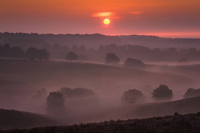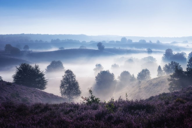 Thời điểm mặt trời vừa lên và sương mù còn dày là lúc thích hợp nhất để chụp ảnh phong cảnh. Bạn có thể phải dậy sớm, nhưng sẽ nhanh chóng quên ngay sự mệt mỏi khi rảo bước trên đồng hoa tím và ngắm bình minh.