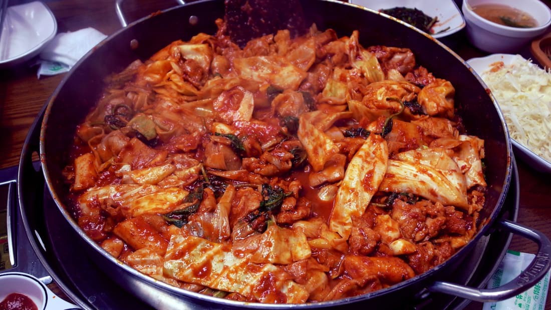 Dak galbi, Chuncheon: Dak galbi là món gà xào cay độc đáo và ấn tượng nhất của thành phố Chuncheon, đông bắc Hàn Quốc. Món ăn này được nấu bằng một nồi lớn ngay trên bàn, thành phần gồm thịt gà, cải xoăn, khoai lang, hành tỏi, bánh gạo, kèm nước sốt cay.