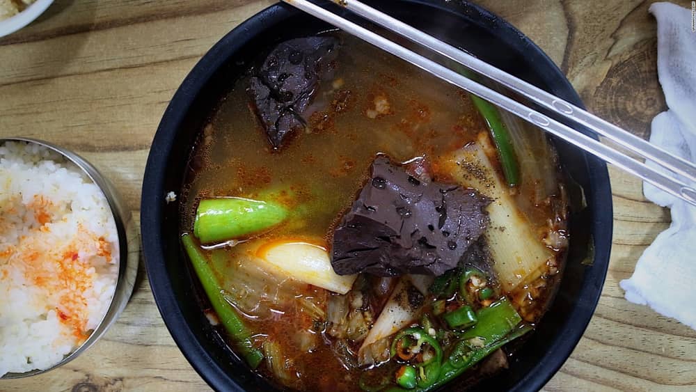 Seonji gukbap, Andong: Du khách tới Andong không thể bỏ qua món Seonji gukbap, món thịt hầm kèm tiết bò có vị ngon ngọt và cay, ăn kèm cơm. Đây là món ăn duy nhất được phục vụ ở Okya, một nhà hàng nhỏ nằm sát khu chợ Sin-Sijang.