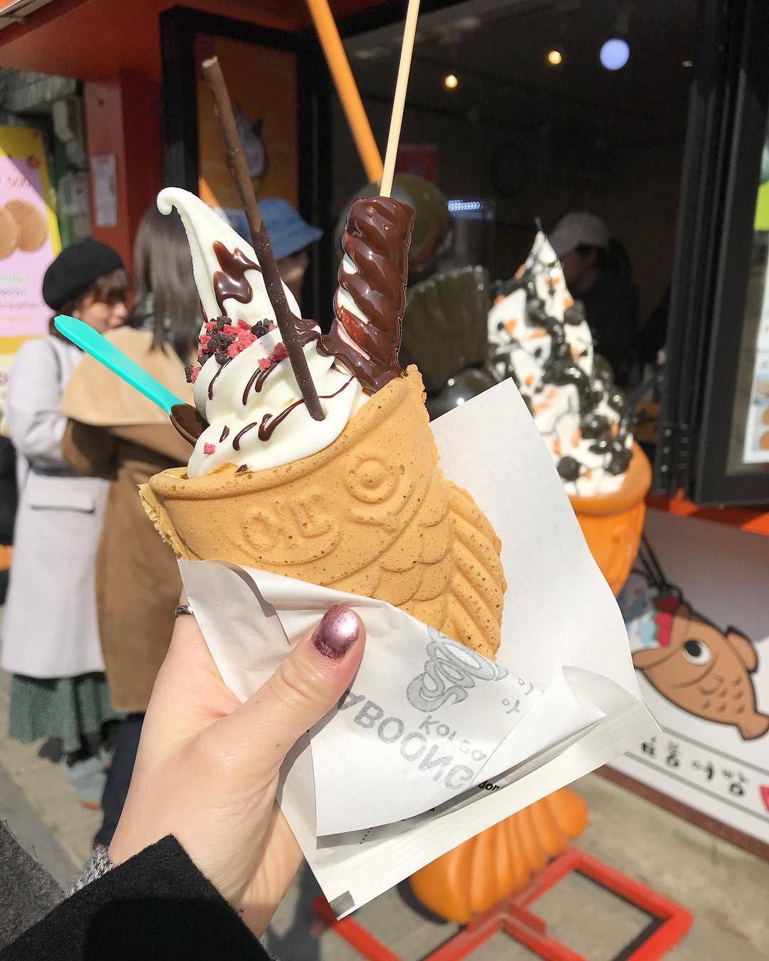 Kem ốc quế dài 32 cm: Thời tiết nóng nực mà có một chiếc kem ống quế dài tới 32 cm thì còn gì tuyệt vời hơn.Bạn có thể dễ dàng tìm thấy món kem tươi này tại khu mua sắm sầm uất Myeongdong hay gần những cửa hàng và siêu thị ở các con phố lớn. Kem có nhiều vị như chocolate, vani, dâu, dưa lưới… tất cả đều tươi ngon và thơm vị sữa. Ảnh: Danialfooddiary.
