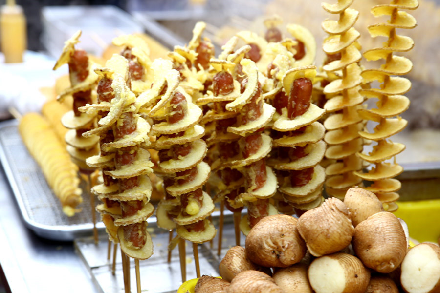 Hàn Quốc còn có phiên bản khoai tây lốc xoáy cùng xúc xích chiên độc đáo. Còn gì thú vị hơn khi đi dạo mua sắm qua những con phố ở Hongdae, Myeongdong, vừa đi vừa cầm trên tay thưởng thức món khoai tây lốc xoáy ngon tuyệt. Ảnh: Danialfooddiary.
