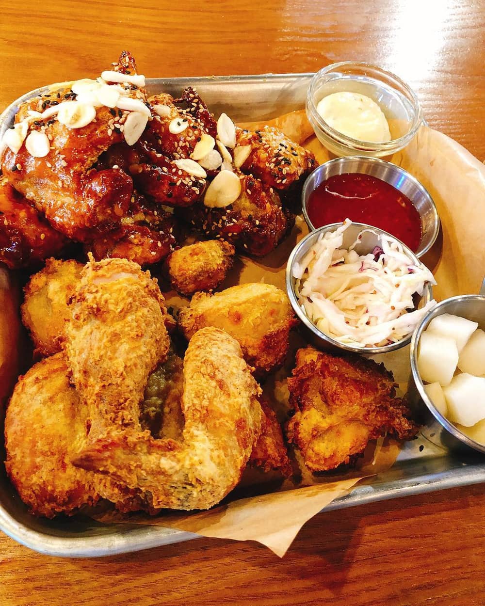 Gà rán: Có người từng nói vui rằng số tiệm gà rán tại Hàn Quốc còn nhiều hơn tất cả các quán Mc Donald trên thế giới cộng lại. Qua đó cũng có thể hình dung gà rán là món ăn nổi tiếng tại Hàn Quốc như thế nào. Khi ăn gà rán tại Hàn, bạn có rất nhiều lựa chọn cho các hãng gà rán nổi tiếng như Kyochon Chicken, Oppadak hay BHC Chicken. Ảnh: @fatins_table.
