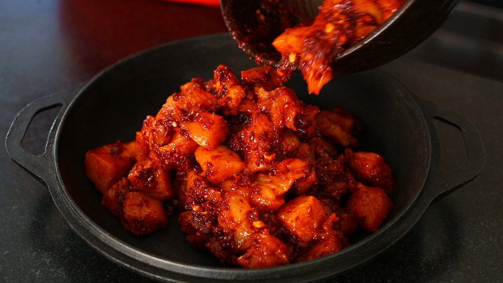 Chỉ mới nhìn thoáng qua, món nakji bokkeum hay bạch tuộc xào đã khiến nhiều thực khách phải e dè. Bạch tuộc được xắt nhỏ, xào cùng các loại rau củ như hành, cà rốt, bắp cải, sau đó cho thêm sốt ớt đỏ gochujang, xì dầu, tỏi, muối và đường.