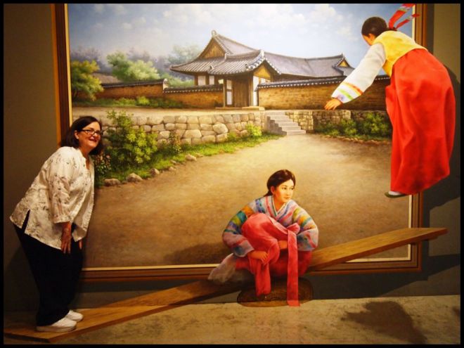 8. Khám phá một Seoul độc lạ: Thủ đô Hàn Quốc không chỉ có cung điện và công viên, mà còn sở hữu vô số điểm mới mẻ để bạn tiêu tốn thời gian, như ghé tiệm Racoon (Cafe Gấu mèo), nhâm nhi cafe và chơi đùa với chú gấu mèo đáng yêu, hay tới bảo tàng Cú, nơi bạn có thể ngắm những tác phẩm nghệ thuật lấy chủ đề từ cú. Seoul Trick Eye Museum (Bảo tàng Đánh lừa Thị giác Seoul) có thể là lựa chọn thú vị để trải qua một chiều mưa, ghi lại những bức ảnh hài hước cùng bạn bè. Ảnh: Blogspot.