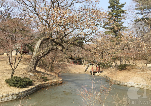 Sau khi tham quan Changdeokgung xong, bọn mình đi qua cổng Secret Garden để theo đoàn đi khám phá khu vườn Huwon. Huwon bắt buộc khách phải đi theo hướng dẫn, cách 30 phút sẽ có một tour, vào một cửa ra một cửa mất khoảng, tour mất khoảng 90 phút. Trời mùa đông lạnh buốt, hai bên đường lá rụng và mặt hồ đóng băng, nhưng nơi đây vẫn rất đẹp. Nếu đi vào mùa thu chắc sẽ còn đẹp lẫy lừng hơn nữa.