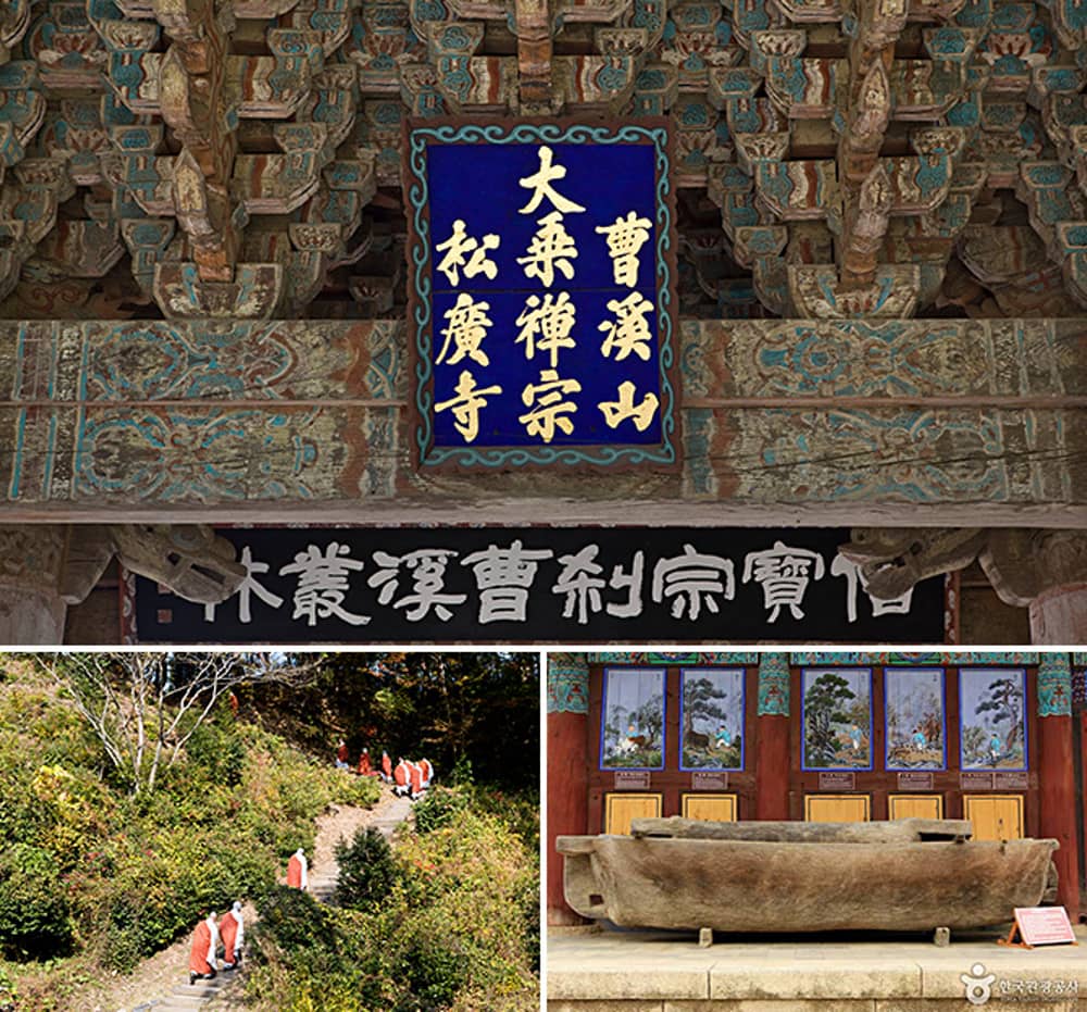 Songgwangsa được biết đến như là chùa seungbo. Điều quý giá ở ngôi chùa này nằm ở các đệ tử của đức Phật – 16 tu sĩ Phật giáo của Hàn Quốc bằng cuộc sống của mình đã giúp mọi người thấy được cuộc đời của đức Phật. Phật giáo là Quốc giáo trong thời kỳ Shilla và Goryeo và các tu sĩ Phật giáo học sâu hiểu rộng và liêm chính được tôn làm guksa, các vị quốc sư. Chỉ riêng Songgwangsa thôi đã có 16 vị như vậy. Chân dung 16 vị sư vĩ đại này được cất giữ tại Sảnh đường Guksajeon, nhưng công chúng không được đến thăm. Thay vào đó, du khách có thể xem các bức ảnh chụp các chân dung này tại bảo tàng Phật giáo. Songgwangsa cũng nổi tiếng với ba đồ vật khác: bisarigushi, một chiếc bát gỗ khổng lồ để đựng cơm có khả năng chứa 4.000 phần ăn; neunggyeonnansa, đồ ăn thủ công được sử dụng để phục vụ thức ăn tại chùa và được ca ngợi vì chi tiết tinh tế và nhất quán của nó; và ssanghyangsu, hoặc cây bách xù sinh đôi, mọc trên bãi cỏ phía sau Cheonjaam. Tất cả các nhánh của những cây này đều hướng xuống dưới và các thân cây được đan xen với nhau.