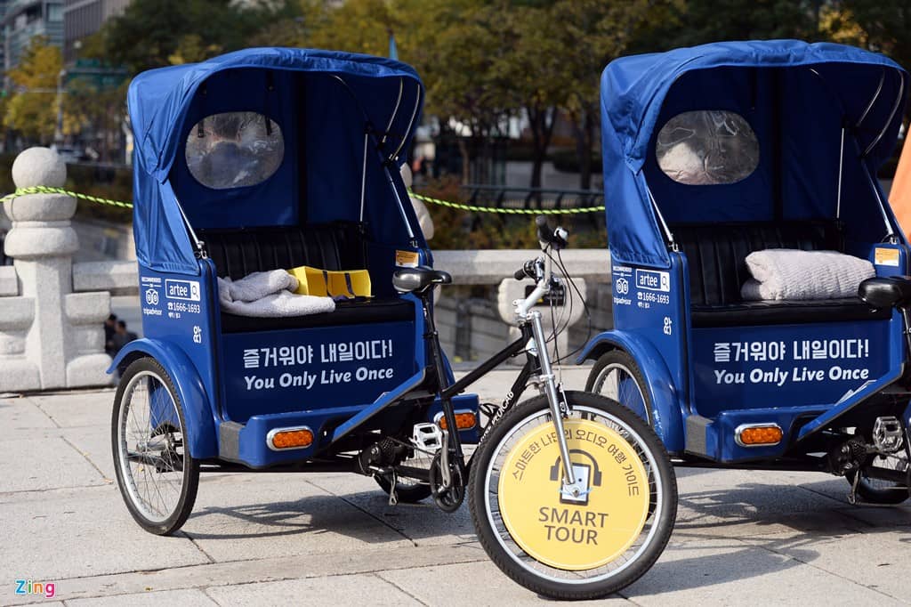 Trên đường phố Seoul thường xuất hiện một nhóm thanh niên đạp xích lô có mui chở du khách tham quan. Đây là một dịch vụ ít người biết, nhưng xuất hiện ở xứ Hàn đã 4 năm.