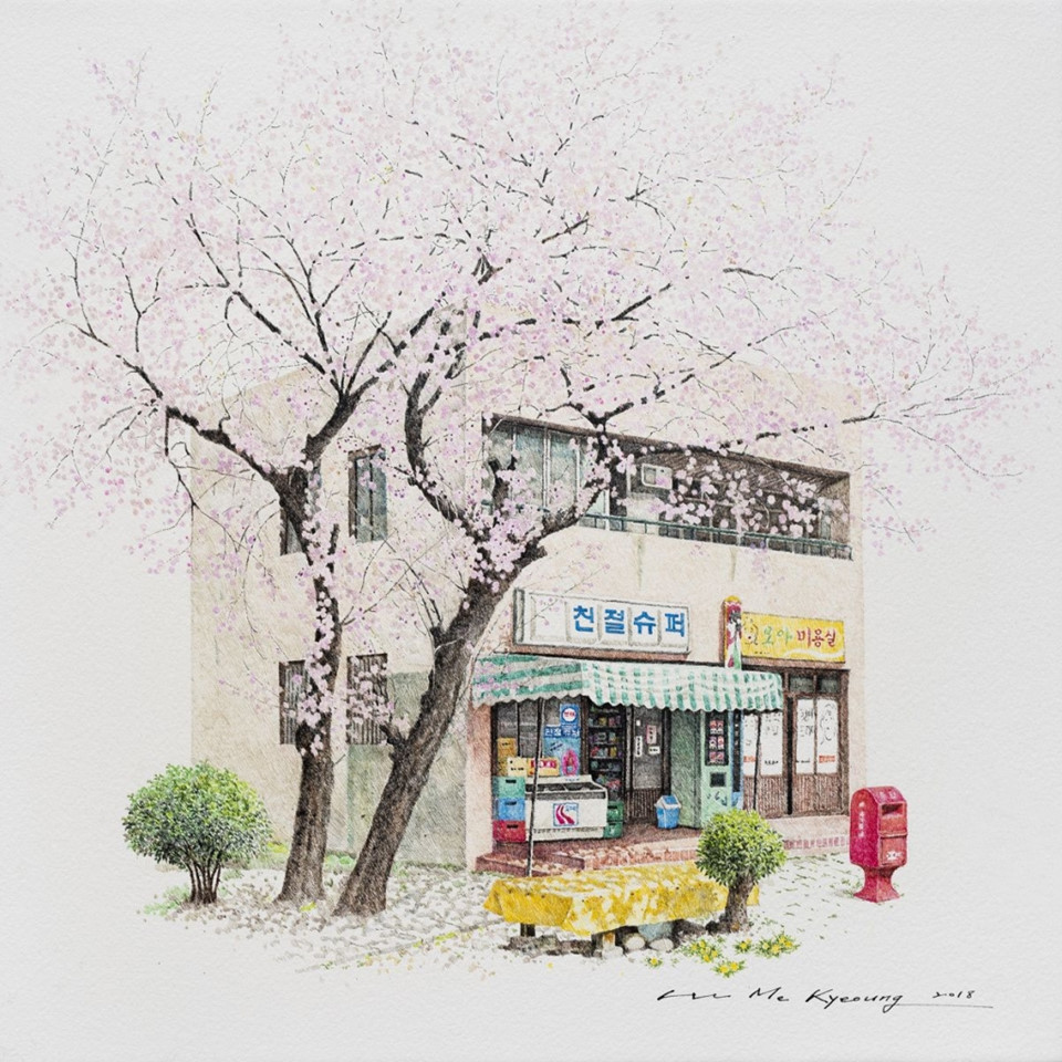 Cửa hàng tạp hóa giản dị bên trong những ngôi nhà gỗ cũ kỹ, hình ảnh gợi nhớ về đất nước Hàn Quốc thập niên 70, 80 là nguồn cảm hứng sáng tác những bức vẽ màu nước duyên dáng của nữ họa sĩ Me Kyeoung Lee.