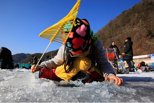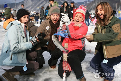 Thời điểm diễn ra lễ hội câu cá hồi trên băng tại huyện Hwacheon, tỉnh Gangwon là từ ngày 4 đến 26/1 hàng năm. Đây là vùng hẻo lánh, băng giá suốt mùa đông và con sông tại đây được phủ một lớp băng dày. Lễ hội là dịp du khách có thể thử câu cá, bắt cá bằng tay, chơi trượt tuyết, bóng băng, đắp tượng tuyết…