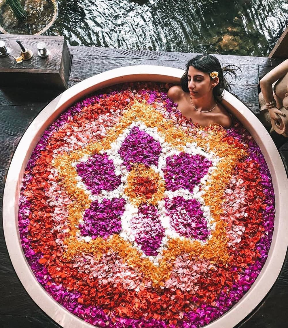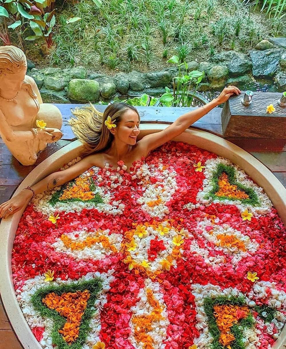 Với hashtag #flowerbath hay #flowerbathbali, bạn có thể tìm thấy cả nghìn kết quả về các bồn tắm đầy hoa ở Bali. Dịch vụ này được ưa chuộng trong vài năm qua. Không đơn thuần là liệu pháp giúp giảm căng thẳng, mệt mỏi, bồn tắm hoa còn được dùng làm bối cảnh cho những bức ảnh tạo dáng, khoe đường cong của các thiếu nữ. Ảnh: Joozi_k, Good_escapes.