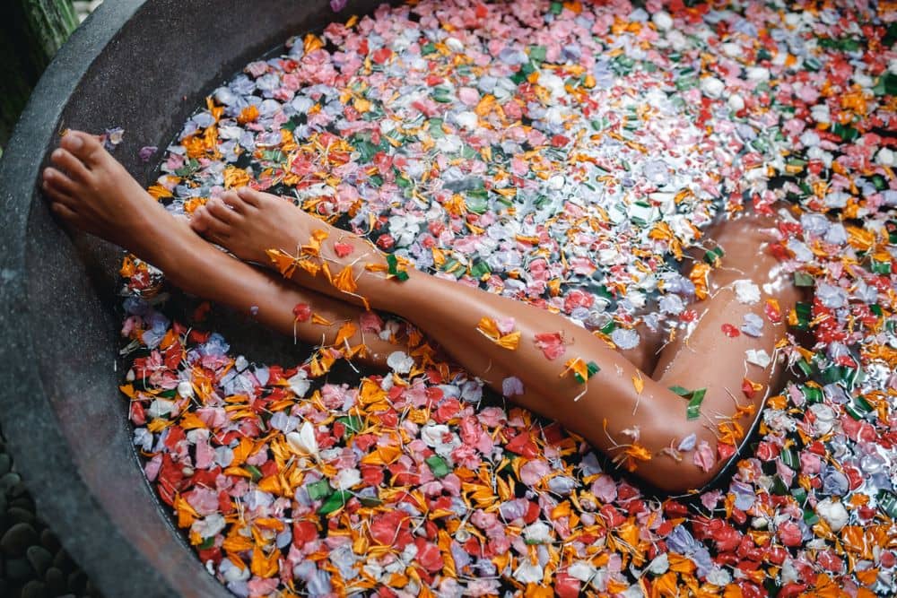 Chủ blog Elite Daily chia sẻ cô từng bị hớp hồn với những bức ảnh chụp bồn tắm hoa ở Bali trên mạng. Trong chuyến ghé thăm hòn đảo này, nữ blogger đã có nhiều lần trải nghiệm cảm giác ngâm mình trong bồn tắm đầy hoa. "Đó là 30 phút thư giãn hoàn hảo. Bạn được đắm mình trong bồn tắm với dầu, thảo mộc và những cánh hoa tươi từ khắp nơi trên đảo. Sau ngày dài di chuyển liên tục, cơ thể và trí não tôi cảm thấy thật sự thoải mái", cô cho biết. Ảnh: Shutterstock.