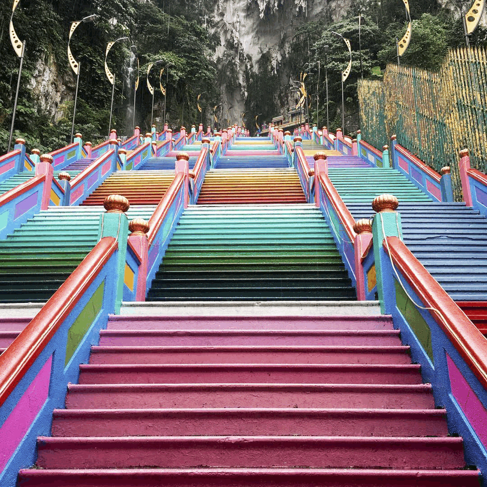 Để lên thăm động chính, nơi có đền thờ Ấn Độ giáo ở độ cao 100m, du khách sẽ phải vượt qua 272 bậc thang. Nếu như là trước kia, đây cũng có thể coi như một thử thách nho nhỏ cần thể lực thì hiện tại, bằng công cuộc thay màu áo cho cầu thang dài này, nơi đây bỗng chốc trở thành địa điểm hút các tín đồ chụp choẹt hơn cả, lý do đơn giản là vì nó quá đẹp, vậy thôi!