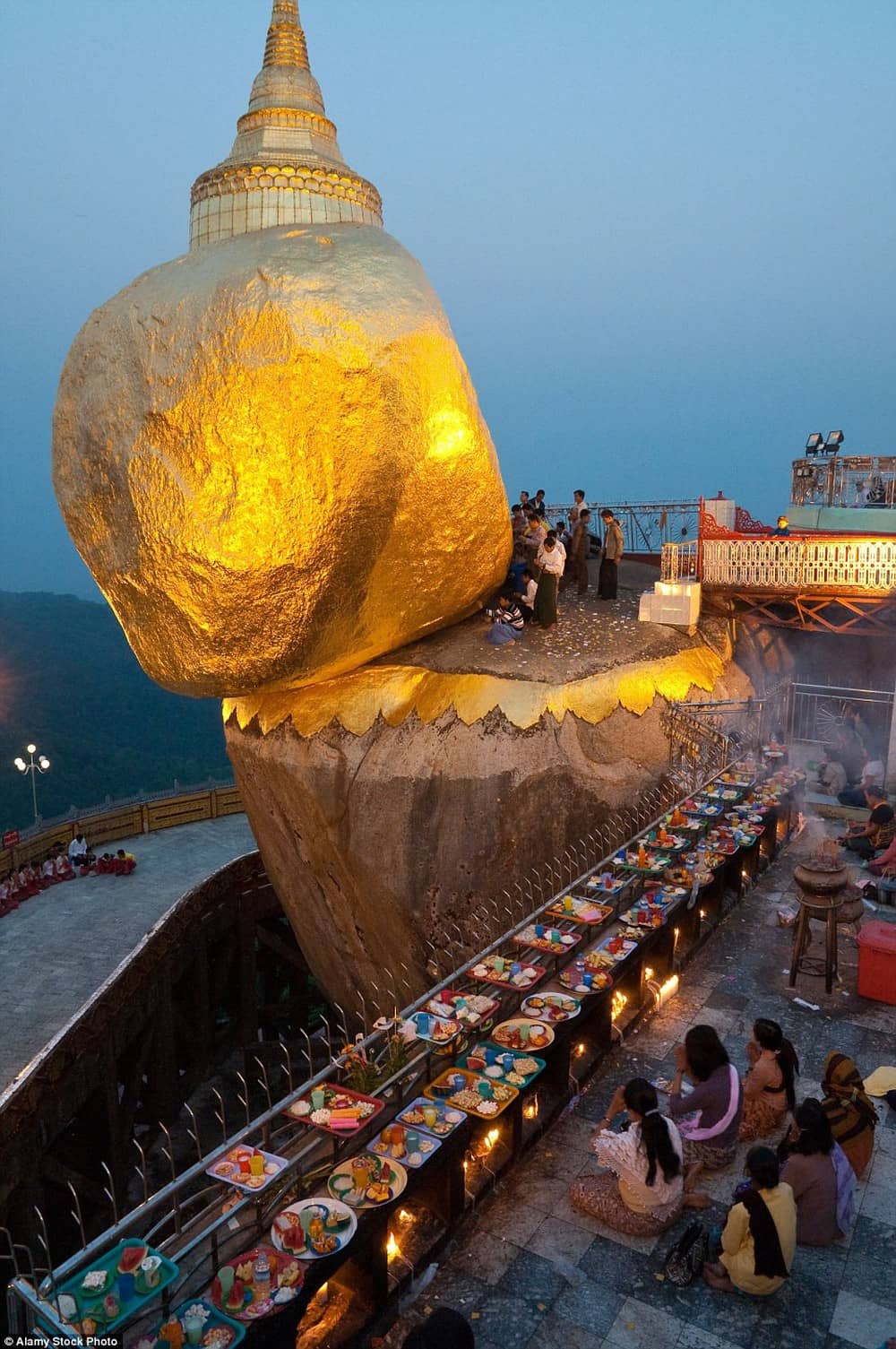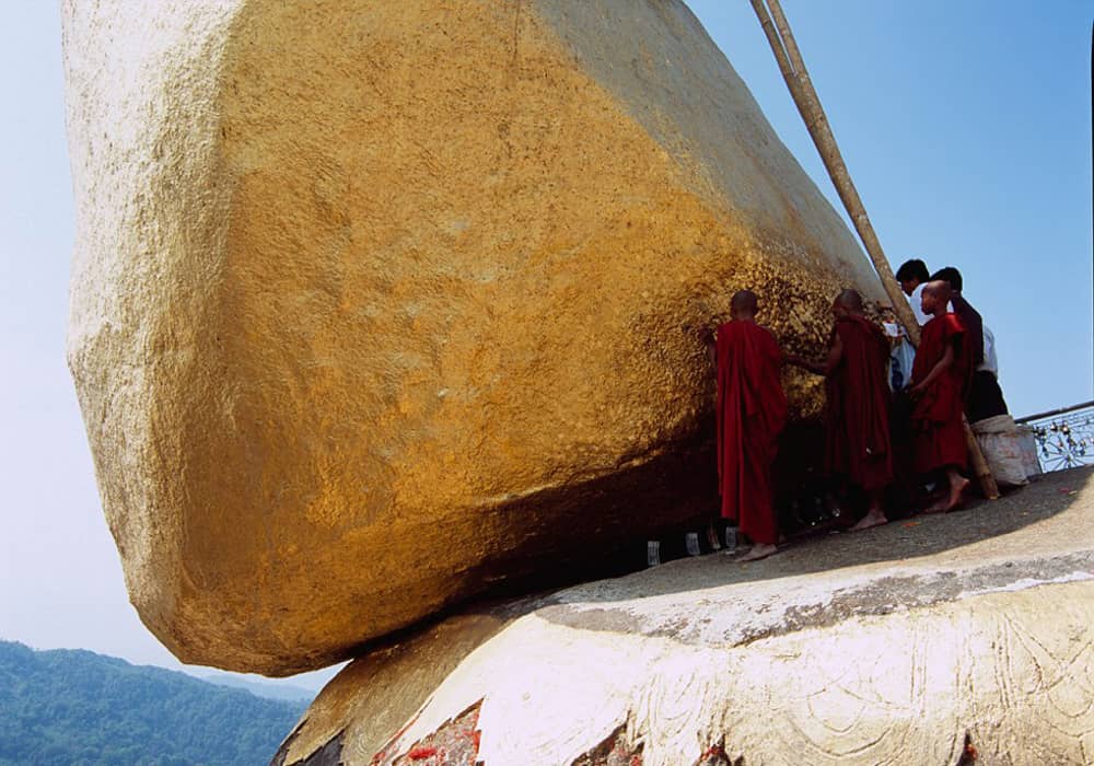 Nằm chênh vênh bên lưng chừng vách núi, ngôi chùa Kyaikhtiyo khiến mọi người choáng ngợp khi tọa lạc trên đỉnh một hòn đá khổng lồ được mạ bằng vàng thật.