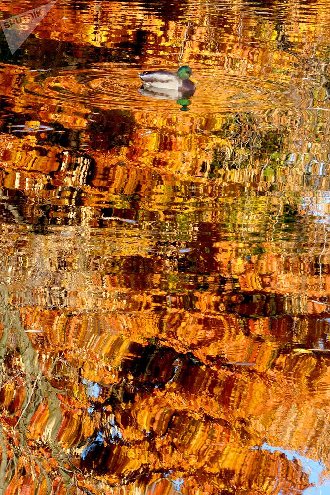 Một chú vịt bơi trên hồ Novodevichy Nhỏ.