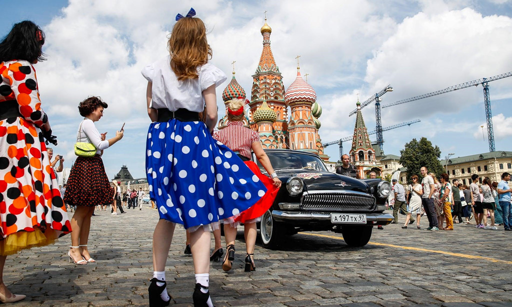 Du khách thưởng lãm những chiếc xe cổ điển ở Quảng trường Đỏ tại thủ đô Moscow của Nga hôm 28/7.