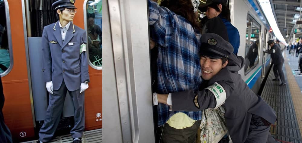 Nghe có vẻ mông lung như một trò đùa nhưng đây là một nghề hoàn toàn có thật ở Nhật Bản. Tàu điện ngầm ở đây luôn trong tình trạng kẹt cứng do nhu cầu đi lại cao, đặc biệt là vào những giờ cao điểm. Nghề này nhìn chung không cần kinh nghiệm gì, vừa có thu nhập lại vừa được luyện cơ bắp miễn phí. Các hành khách chỉ việc đứng yên một chỗ để nhân viên nhà ga đẩy họ vào trong khoang tàu, sao cho cửa tàu có thể đóng khít.